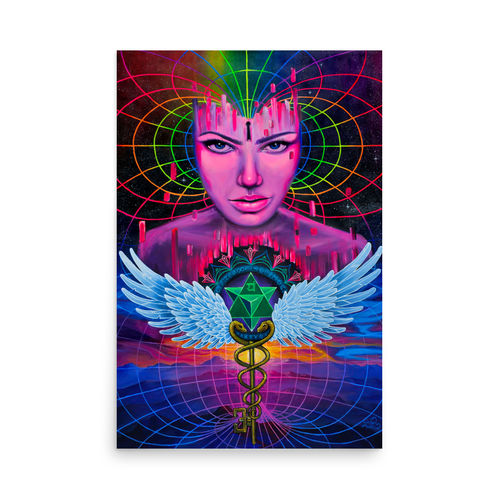 matter from her thought waves and emotional waves. The caduceus key has been turned into a symbol meaning doctor in modern times, but is actually an ancient symbol to do with spirituality. This goes all the way back to ancient Egypt. You may have seen a pharaoh with a snake coming out of their third eye, that is what this symbolizes. They have healed all parts of their consciousness and are enlightened. They lead the people and create reality from a place of wholeness and inner peace and transformation. They have graduated from the Egyptian Mystery Schools which required drinking of a psychedelic brew, and journeying into the underworld to face themselves. The snakes are kundalini energy, the staff is a spine, the ball that is often on top is the pineal gland. The wings represent the heavens and enlightenment.. There is a “Merkaba” in the center of her heart space as well. Mer = light, Ka = spirit, Ba = body. Light Spirit Body. It is also found in Anahata, the heart chakra symbol. Upward and downward triangles create balance, a unity of up and down. These ancient symbols mean many things. This piece is called Consciousness 2 because it is a remake of a piece I did several years ago that I wanted to tackle again.