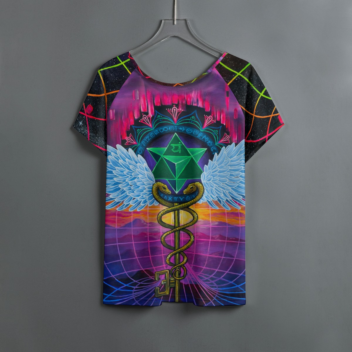 coming out of their third eye, that is what this symbolizes. They have healed all parts of their consciousness and are enlightened. They lead the people and create reality from a place of wholeness and inner peace and transformation. They have graduated from the Egyptian Mystery Schools which required drinking of a psychedelic brew, and journeying into the underworld to face themselves. The snakes are kundalini energy, the staff is a spine, the ball that is often on top is the pineal gland. The wings represent the heavens and enlightenment.. There is a “Merkaba” in the center of her heart space as well. Mer = light, Ka = spirit, Ba = body. Light Spirit Body. It is also found in Anahata, the heart chakra symbol. Upward and downward triangles create balance, a unity of up and down. These ancient symbols mean many things.