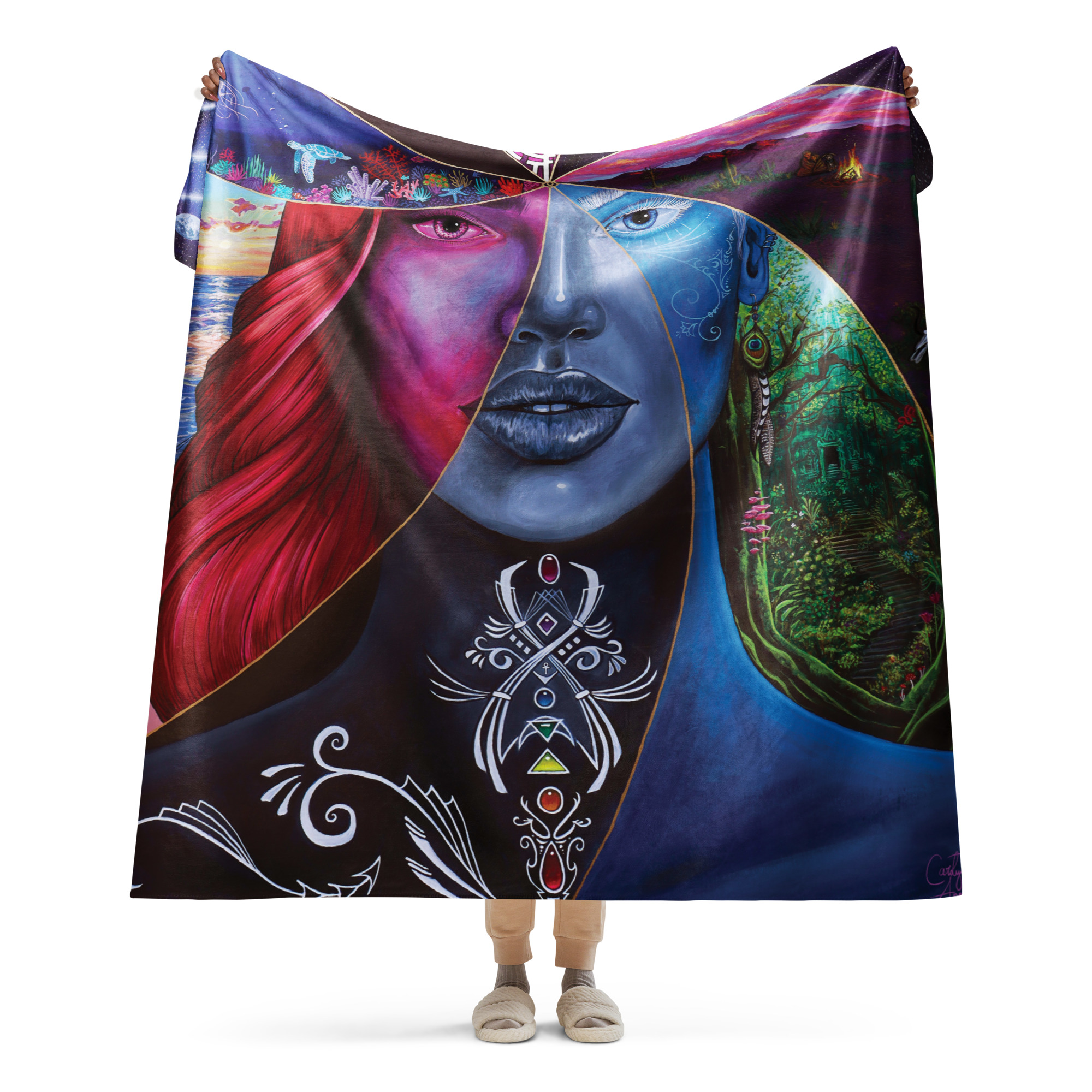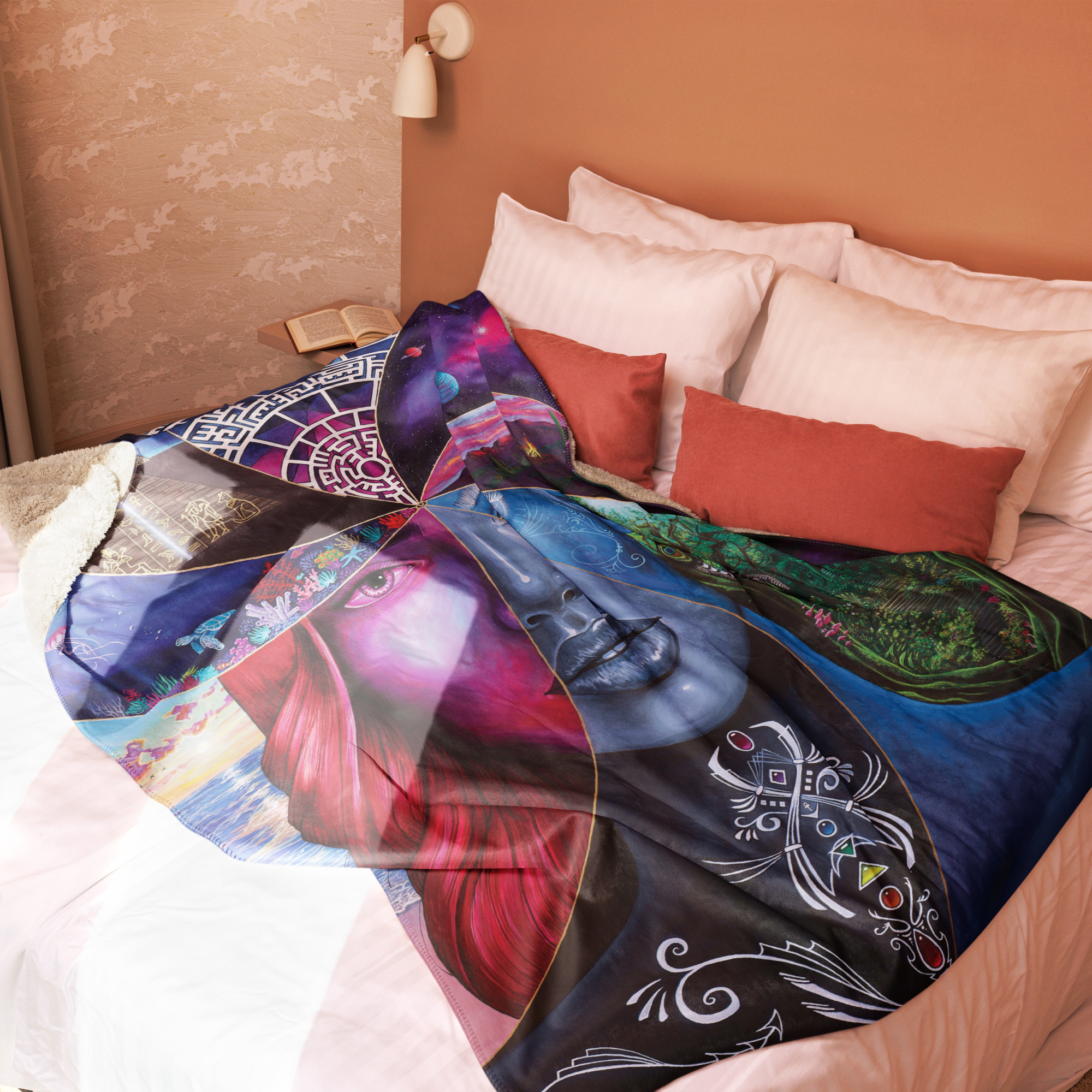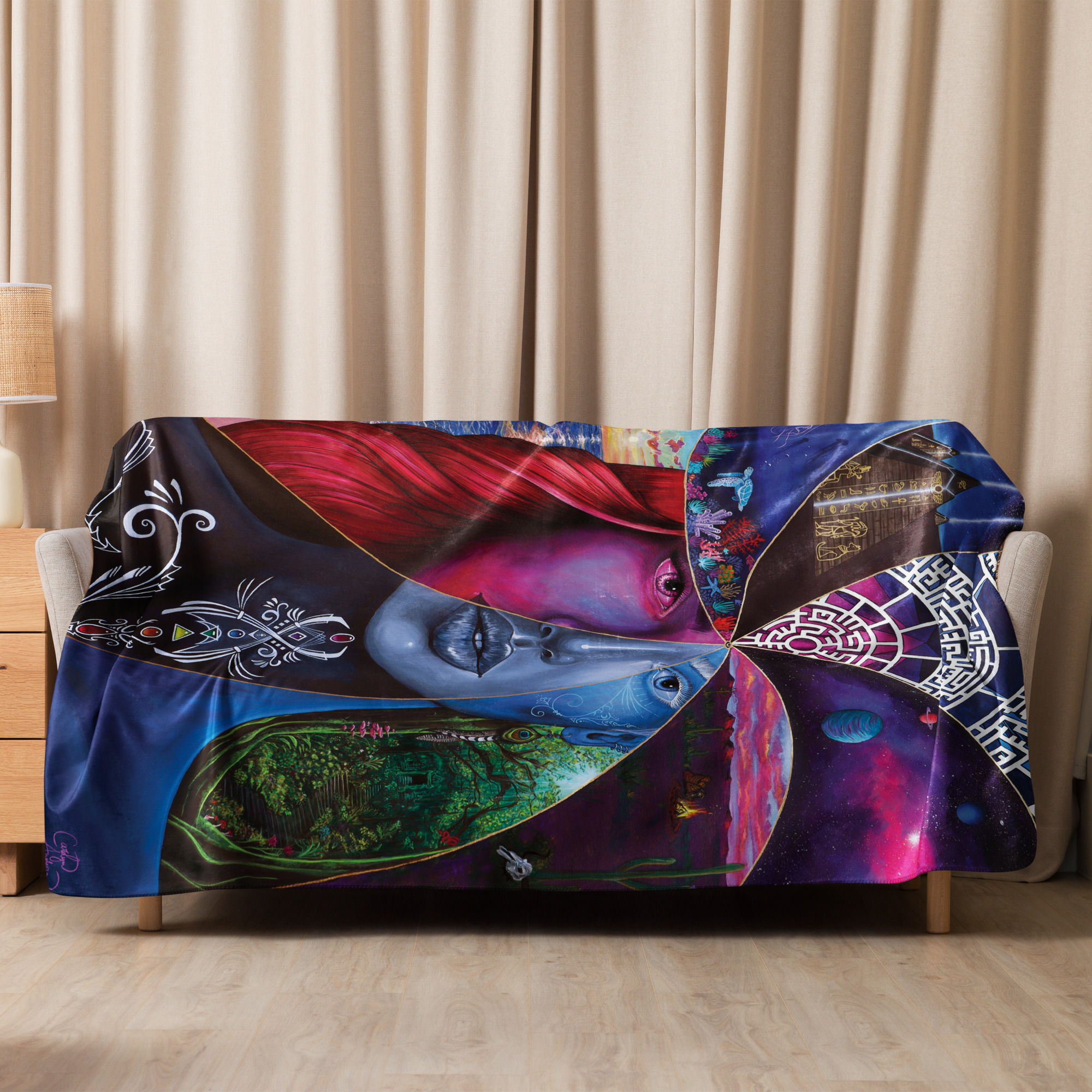 Dimensions – This piece is about dimensions and the journey of the soul. The jungle with the door in the back is very symbolic of a shamanic journey. There are amanita muscaria mushrooms to greet you, and a snake in the tree to represent your ego. The peacock feather earing is about the transmutation of the soul, the great alchemical secret wasn’t turning lead into gold but your own soul into divinity. Healing all blocks from love, and self empowerment as well as constructing a brilliant intellectual framework. I contrasted the jungle with the ocean which is also representative of reality. We are but a drop in the ocean and the ocean itself. The pyramids make me think of ancient Egyptian mystery schools where Pythagoras and other brilliant minds studied the mysteries and spread the information all over earth. Thoth, Osiris and Bastet are some of my favorite Gods and Goddesses of that time period. There are peyote buttons, a UFO and other fun little things hidden around this piece. And a little tiny Charlie, my dog, chillin’ by the fire. The couple with him are the lovers. They represent the masculine and feminine, huddled together by the fire which is about twin flames and their sacred healing journey together. Mainly with this piece I wanted to explore the idea of the multiverse and infinite time and lives. The white pattern is symbolic of the code underneath reality. The infinite information that we pull from to create the experience of reality itself. Very similar to computer code. The quantum field has all possibilities until we choose with our thoughts, feelings and actions to create the experience we get.