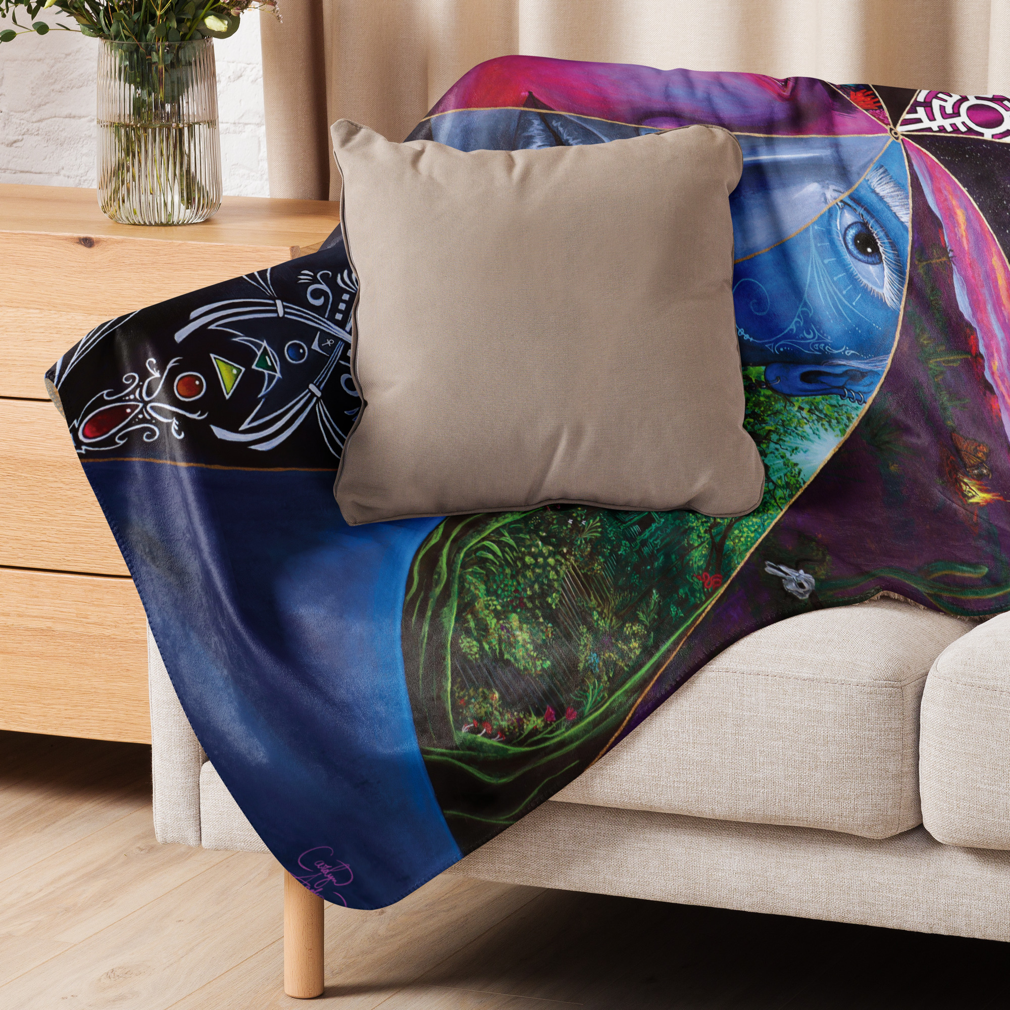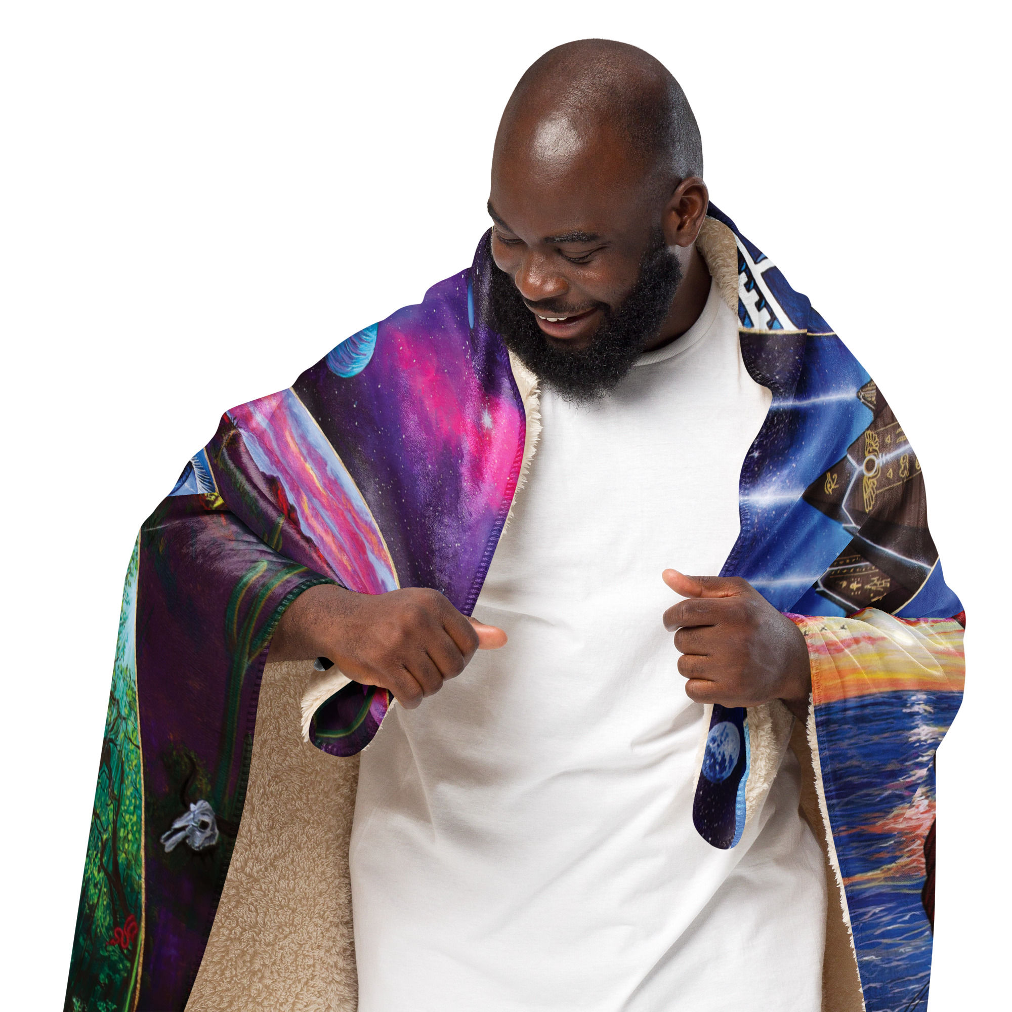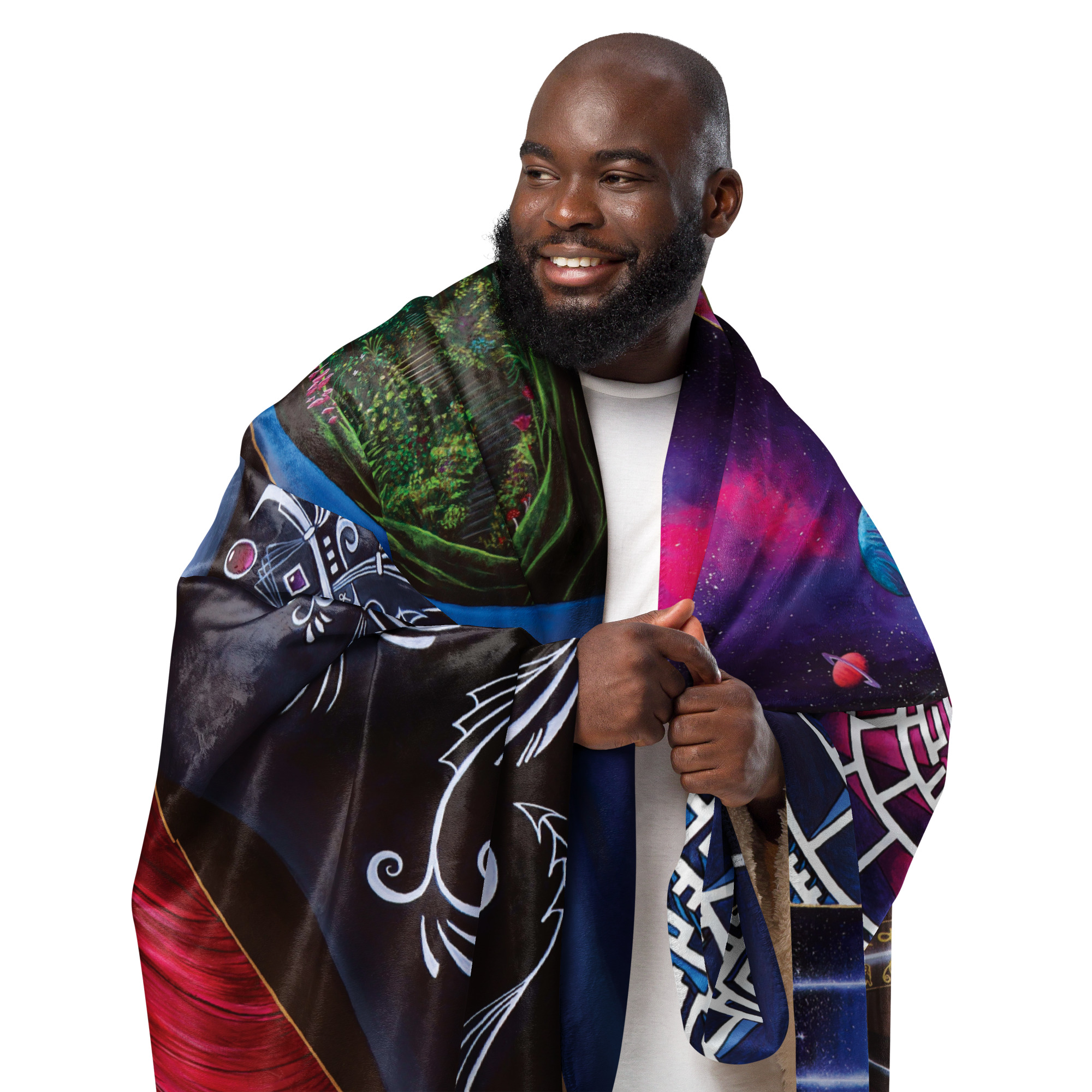 Dimensions – This piece is about dimensions and the journey of the soul. The jungle with the door in the back is very symbolic of a shamanic journey. There are amanita muscaria mushrooms to greet you, and a snake in the tree to represent your ego. The peacock feather earing is about the transmutation of the soul, the great alchemical secret wasn’t turning lead into gold but your own soul into divinity. Healing all blocks from love, and self empowerment as well as constructing a brilliant intellectual framework. I contrasted the jungle with the ocean which is also representative of reality. We are but a drop in the ocean and the ocean itself. The pyramids make me think of ancient Egyptian mystery schools where Pythagoras and other brilliant minds studied the mysteries and spread the information all over earth. Thoth, Osiris and Bastet are some of my favorite Gods and Goddesses of that time period. There are peyote buttons, a UFO and other fun little things hidden around this piece. And a little tiny Charlie, my dog, chillin’ by the fire. The couple with him are the lovers. They represent the masculine and feminine, huddled together by the fire which is about twin flames and their sacred healing journey together. Mainly with this piece I wanted to explore the idea of the multiverse and infinite time and lives. The white pattern is symbolic of the code underneath reality. The infinite information that we pull from to create the experience of reality itself. Very similar to computer code. The quantum field has all possibilities until we choose with our thoughts, feelings and actions to create the experience we get.